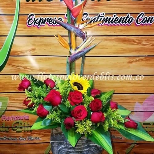 arreglo floral con aves del paraíso de altura y rosas rojas.